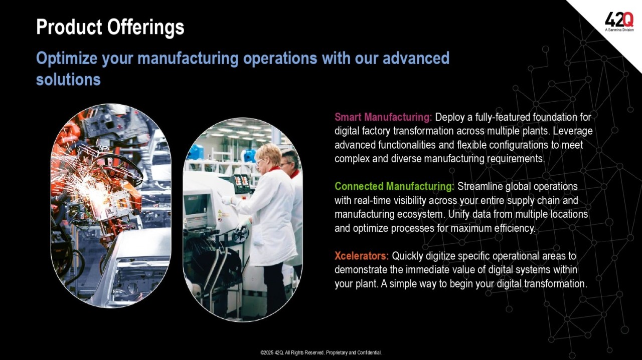 Another advantage 42Q brings to the market is Connected Manufacturing, the infrastructure to create a single data pipeline to consolidate operational data. It streamlines operations by integrating data from all suppliers’ locations, offering a unified, single-pane-of-glass view, empowering teams with insights to make informed decisions and optimize global operations. A customer reported that 42Q has allowed them to consolidate data from their global factories and to support a data pipeline into their manufacturing data lake for analysis at scale. Customers can use this not only to identify quality issues but also to support benchmarking. Connected Manufacturing can also be used to discover emerging best practices at a local level that can be leveraged globally.