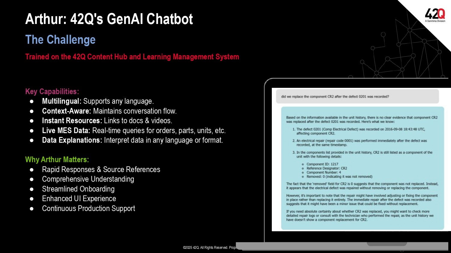42Q has released their own Chatbot, Arthur. Arthur has been trained in the 42Q Content Hub and Learning Management System, leveraging 30 years of global manufacturing expertise. Powered by the advanced Claude Sonnet LLM and orchestrated by Amazon Bedrock, Arthur provides accurate, context-rich responses through Retrieval Augmented Generation (RAG). Arthur is multilingual, context-aware, and can interpret data in any language or format. Consider Arthur, the knowledgeable senior shop expert who can quickly evaluate an issue based on their experience and offer alternative approaches for solving problems, ensuring reliable, actionable insights without the risks associated with general-purpose GenAI.