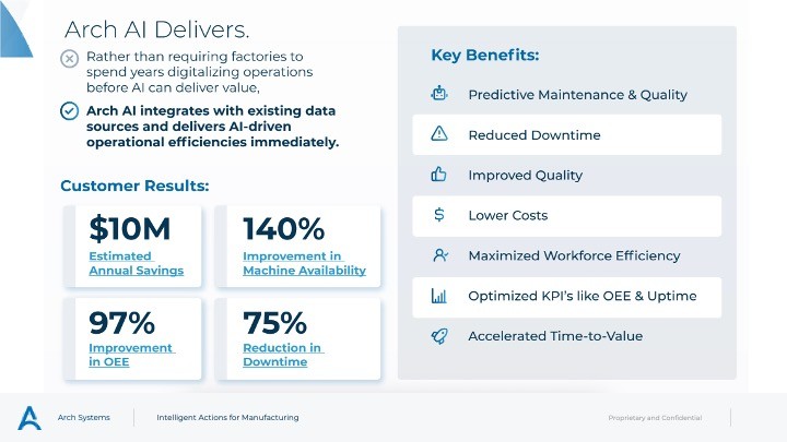 CapEx Avoidance – With less downtime, higher quality, and improved yield, companies can defer or avoid adding equipment for increased throughput demands. One company reported $7M CapEx avoidance and ROI in less than three months as a result of visibility from Arch.