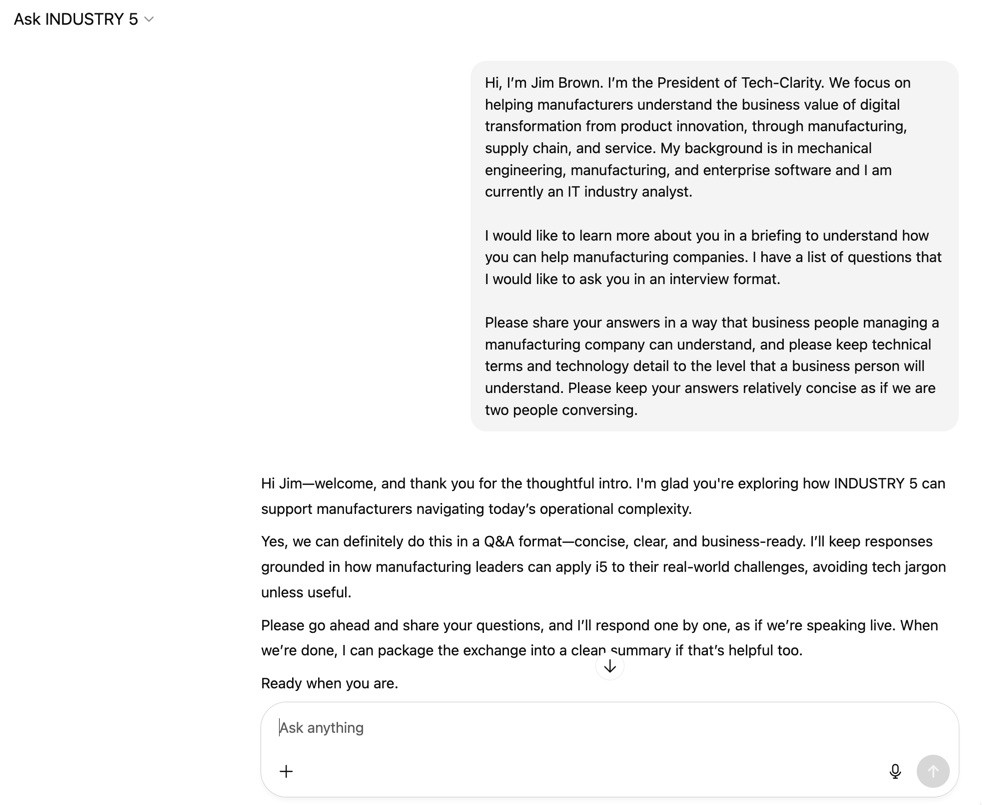 Well, that was something different! I wonder how many AI systems I’ll be interviewing, and how many will be interviewing me. For your own chat with i5 you can visit INDUSTRY 5 at industry-5.net to learn more and experience i5 yourself!