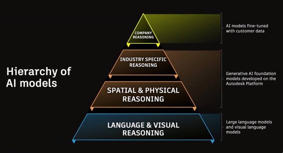 This year, Autodesk shared a lot of AI progress. Last year we learned about Project Bernini, Autodesk’s R&D effort into AI for 3D shape creation. It turns out that Bernini was one of several foundation models that the Autodesk AI Lab was investing in. Autodesk is doing something unique. They are creating foundation models for 3D, as a corollary to the large language models (LLMs) that fuel AI giants like ChatGPT. Most of the research has gone into the detailed aspects of geometry like constraints and attachment points to precisely control models. The result is professional-grade foundation models for 2D and 3D. Their strategy is to have a hierarchy of AI models (see graphic) that starts with LLMs and concludes with industry specific models that understand 3D, CAD, physics, and event behavior. Following that will be customer specific models that can incorporate and apply detailed company knowledge.