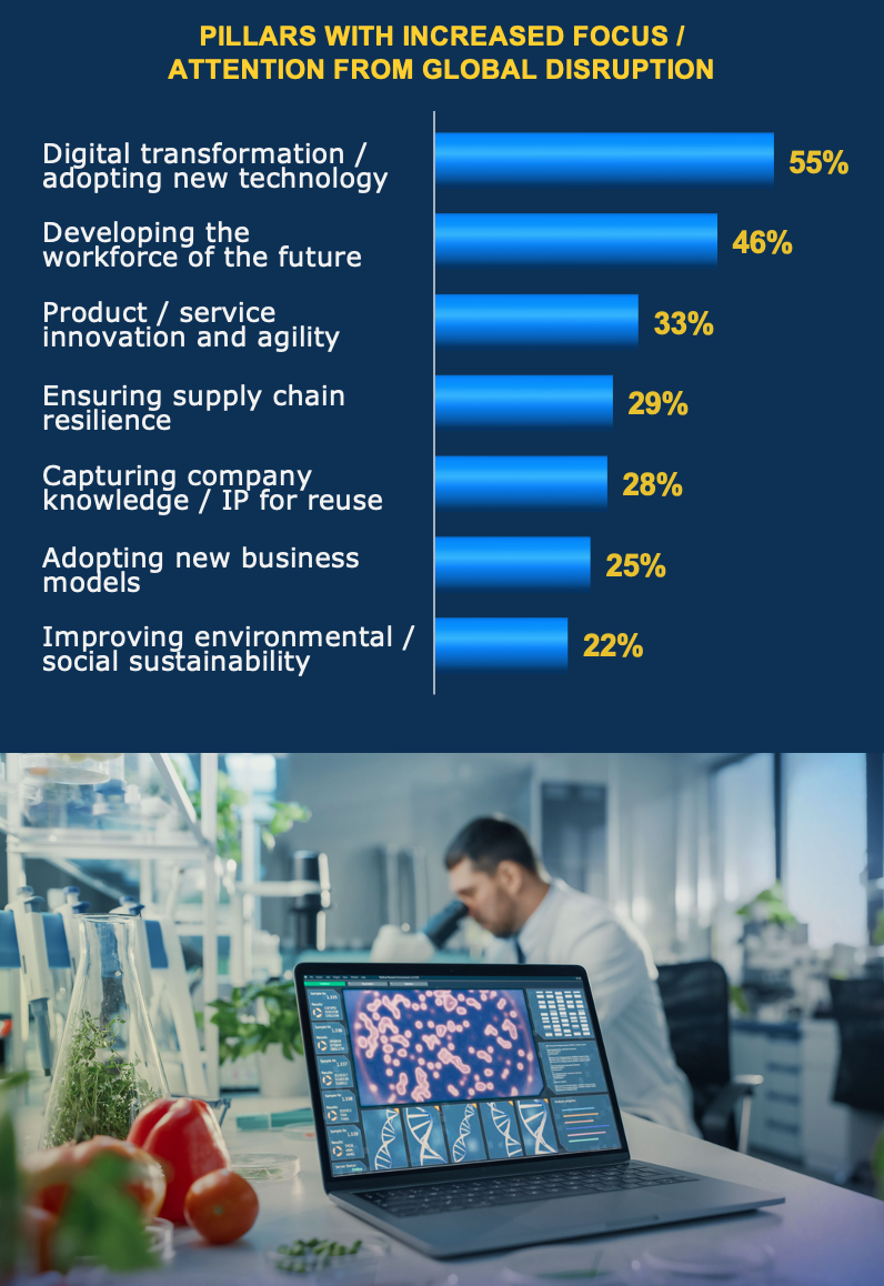 The pillars of business sustainability provide a framework of business priorities to act on. The survey shows that companies continue to focus on all of the pillars required for long-term business success, again increasing their focus on digital transformation and adopting new technology.