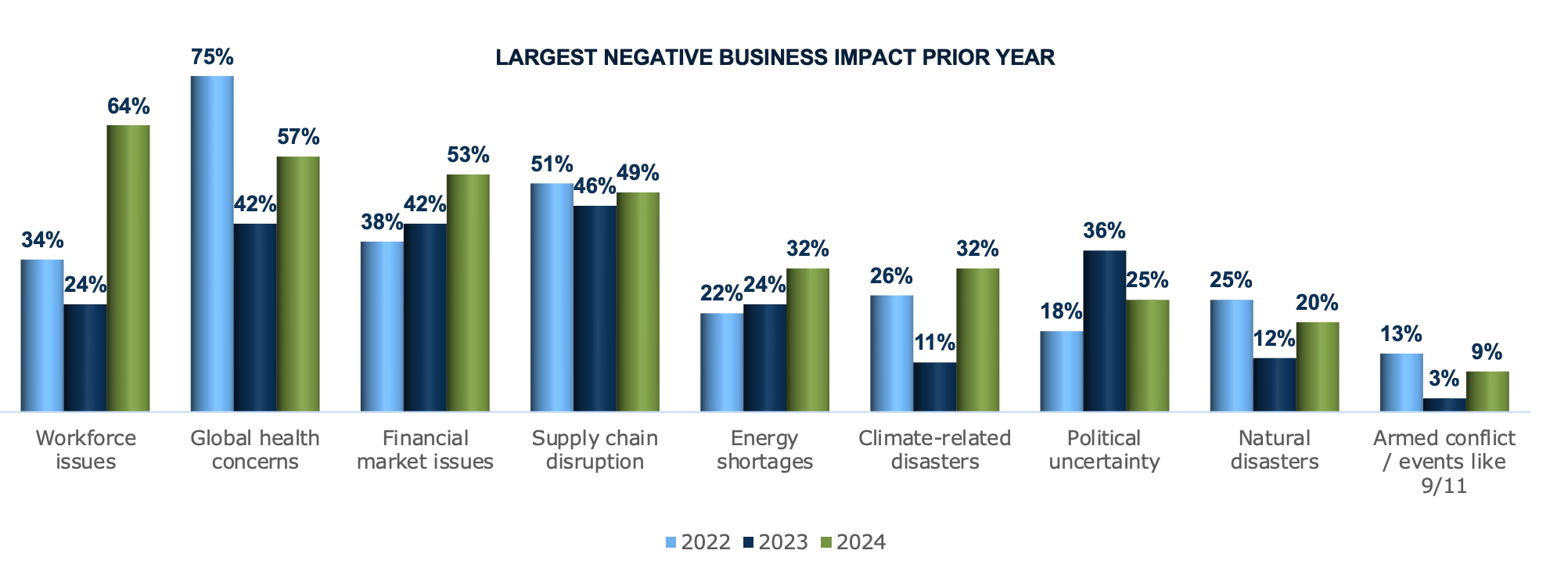 Respondents report a variety of issues with significant negative impacts on their business over the last year. The impact of workforce issues has more than doubled and became the most commonly reported issue, followed by global health concerns which rose from last year but is still significantly lower than in 2022. It appears that concerns about the pandemic have not fully subsided as expected. In addition to these human issues, financial market issues had an increased impact last year, likely due to continued uncertainty.