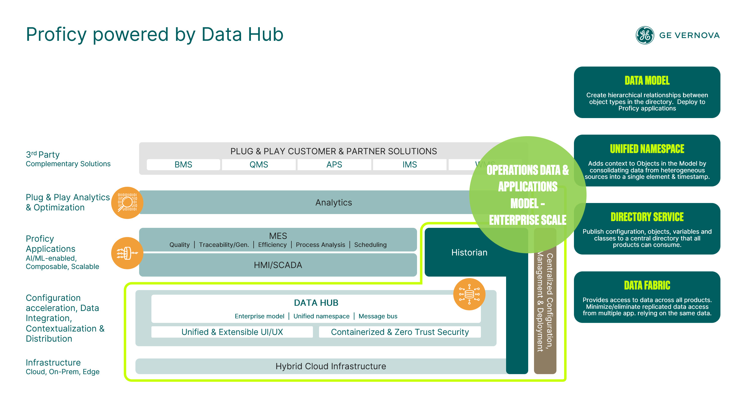 The central, consistent Data Hub can support enterprise-wide consistency and governance. The previously released Proficy Operations Hub helps domain experts design visual user experiences with low-code/no-code and includes analysis widgets. Together, the Operations and Data Hubs can help configure any Proficy software for each customer’s (and each role’s) needs and deploy across one or many plants. It can also support coherent data viewing and analysis.