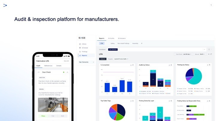 EASE is available as a SaaS subscription. The base audit & inspection version of EASE supports mobile audit and inspection checklist authoring through both pulling existing checklists and creating new ones. It also incorporates automated scheduling, findings management, and real-time data and dashboards for clear visuals of audit results. Naturally, EASE must connect to the systems of record, including QMS, MES, and CMMS. EASE Connect also enables bulk data access for BI tools and dashboarding, while Insights is their own dashboard solution that delivers custom-built dashboards specific to individual customers.
