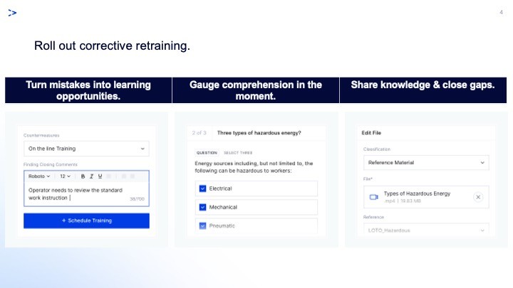 A new release from summer 2025 includes OTJ capabilities. In performing corrective actions, EASE saw a way to facilitate training. As operator errors and poor training are shared drivers of non-conformances across the customer base, this became a clear need. Customers generate training from existing documents and publish it as contextual training that is triggered from findings. It can accommodate individual or group training, quiz users, and require sign-offs after training, also checking whether it addressed the issue. With the current “gray tsunami” of knowledgeable workers retiring, this need is only increasing.
