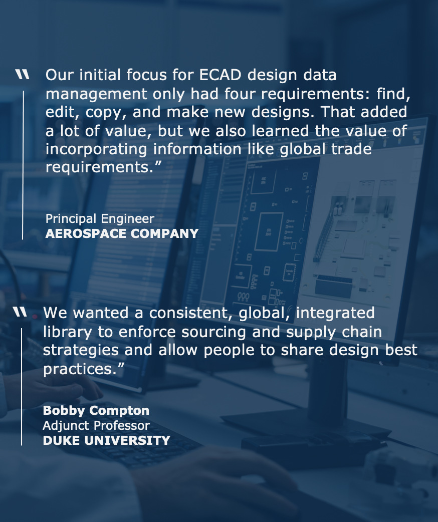 Companies must increase the efficiency of their engineers and engineering teams. They can’t do it without integrating electronic design data into the full product digital thread. First, engineers must have data readily available to make design decisions to get products right the first time. They should have accurate, up-to-date information in a common environment and centralized ECAD data management across teams, locations, and systems to enable collaboration and reuse. As a principal engineer for an aerospace company explains, “Ideally, I want one master system that talks to all ECAD systems, manages the whole ecosystem, and talks to multiple toolsets and PLMs.”
