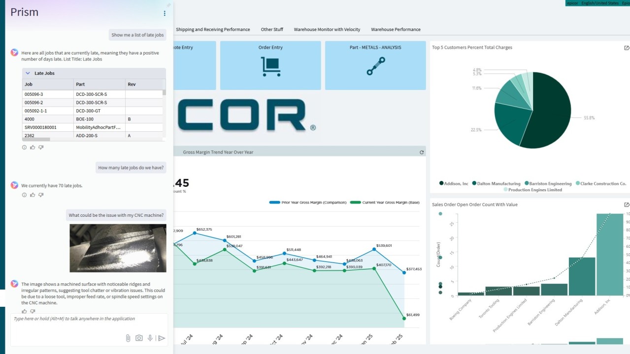 Prism includes conversational AI for employees to interact with ERP, and Epicor plans to integrate automation and causal AI in the future.