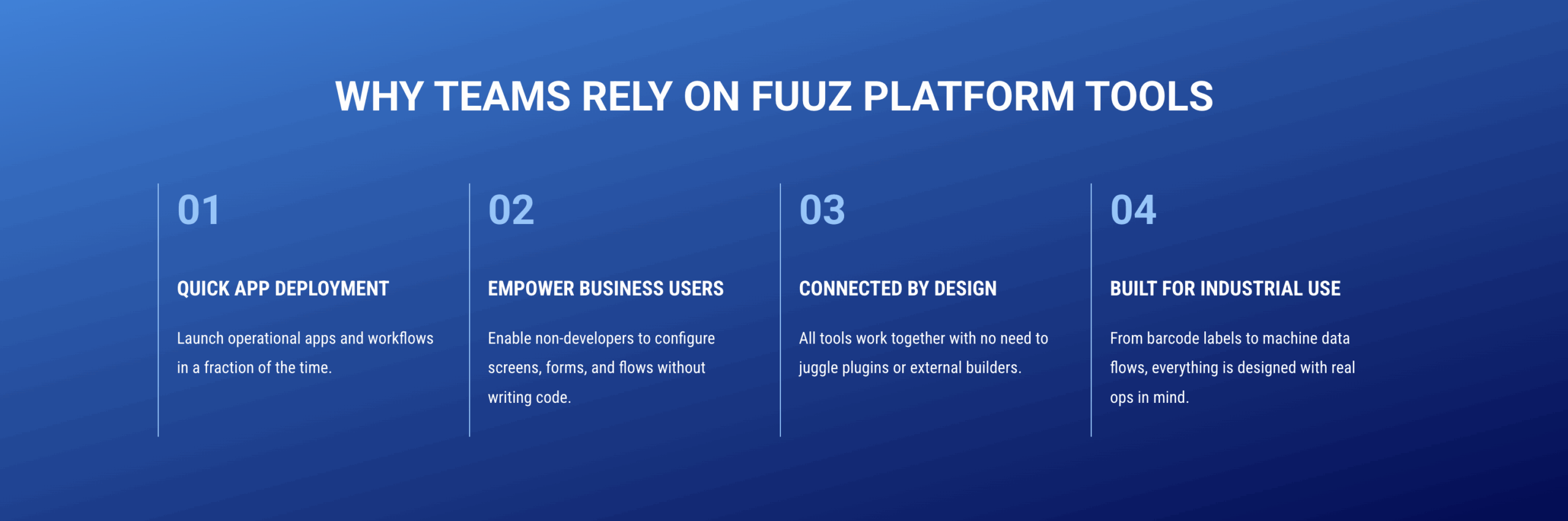 Tailor UIs, Workflows, and Apps – The Fuuz Platform offers tools, including a responsive UI builder, a workflow builder, and its own apps, as well as low-code app-building capabilities. A key differentiator is that they built these tools to address the scaling challenges of low-code/no-code solutions, implementing them as an SI before shifting entirely to a software company.