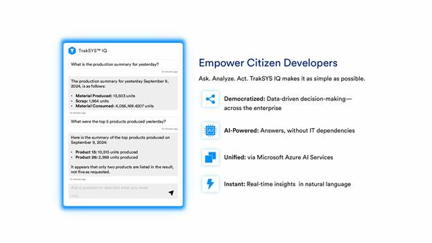 TrakSYS IQ Assistant, an AI chat feature being added to the product, utilizes Azure Open AI. This will let users ask questions about their TrakSYS data and get insights, charts, and tables in return. It will support multiple languages and allow actions like creating pie charts or adding trend lines. Discussions are ongoing about role-based access control to protect data security within the AI assistant. Regional data governance is also being explored, with a prototype currently in private-preview with select customers.