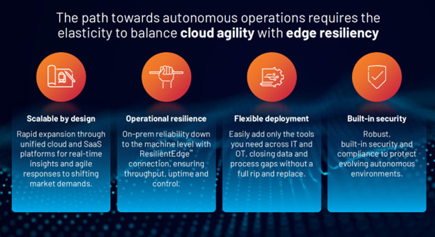 A crucial component of achieving manufacturing autonomy is resilient edge-to-cloud connectivity. Rockwell has Plex, one of the first cloud-native MES systems, and the FactoryTalk suite, which includes MES on the edge. Their strategy is to bring these two products together and unify their portfolio. As presented by Hayden Foot, Rockwell is extending Plex with a lightweight, resilient edge component called FactoryTalk ResilientEdge. Available in Q1 2026, this will leverage the elasticity of the cloud with the resiliency of the edge. Rockwell claims this capability will enable 24/7 factory operation, as the resilient edge will react if the cloud connection is disrupted and keep IT and OT systems synchronized.
