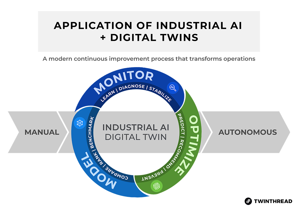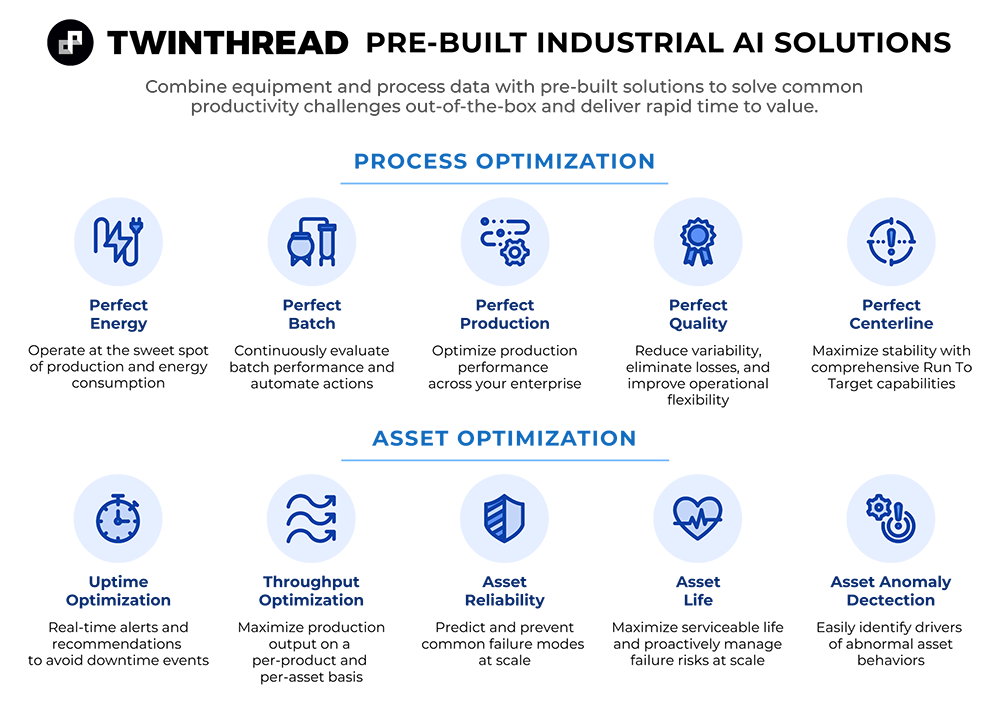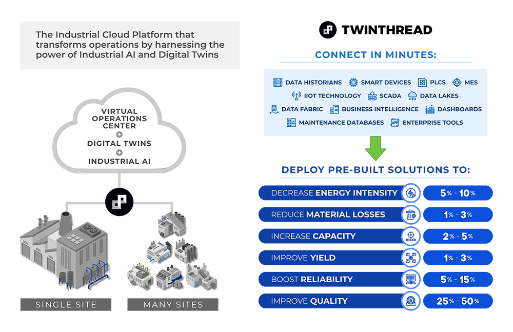 TwinThread offers a cloud-native SaaS AI platform based on a digital twin with pre-built applications. They claim these solutions connect rapidly to existing systems, often deliver insights within hours, and solve complex industrial problems within days. The improvement-focused offerings are designed for mid-size and large companies in two primary markets: