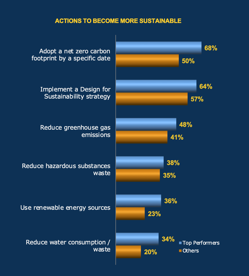 A well-defined sustainability strategy can give a semiconductor company a competitive edge. Many customers increasingly focus on producing energy-efficient, sustainable products with a reduced carbon footprint. Consequently, these customers are more likely to engage with semiconductor companies that prioritize sustainability. The graph shows the top actions taken by Top Performers to become more sustainable