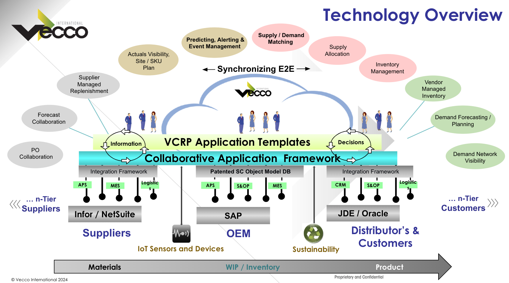 Vecco’s internal patented AI-based semantic object model harmonizes disparate data and systems across the supply chain and executes multi-party business processes. End-to-end solvers work in real-time to mitigate problems and avert supply chain risk. AI could be used ‘atop’ the VCRP solvers to enhance decision intelligence with external data.