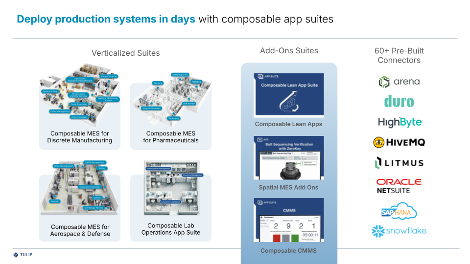 Tulip’s reach grew from its roots in discrete manufacturing to include life sciences—encompassing pharmaceuticals, biotech, and medical devices—and now extends to aerospace and defense. Tulip has continued innovating in content and data management, edge and enterprise connectivity, and security and governance throughout this evolution.