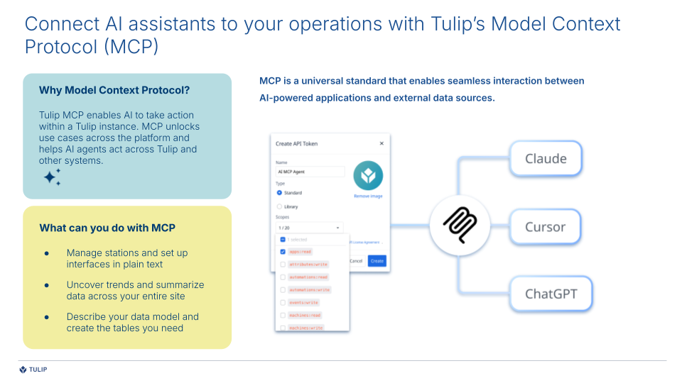In 2024, Tulip added a workflow engine to the application creation suite. This capability is called “Automations”, as it is the ability to define workflows and automate them. Like other Tulip capabilities, their library has predefined automations for everyday tasks (more than fifteen at this writing) such as inventory update, part counts, Andon alerting, and production status. As the MES vendor community evaluates the uses of GenAI and LLMs in production, Tulip has built MCP server, their official implementation of the Model Context Protocol for the Tulip platform and is using existing connections and automations as a bridge to Agentic AI. The library already includes two: AI Automation – Defect Characterization and AI Automation – Defect Summarization.